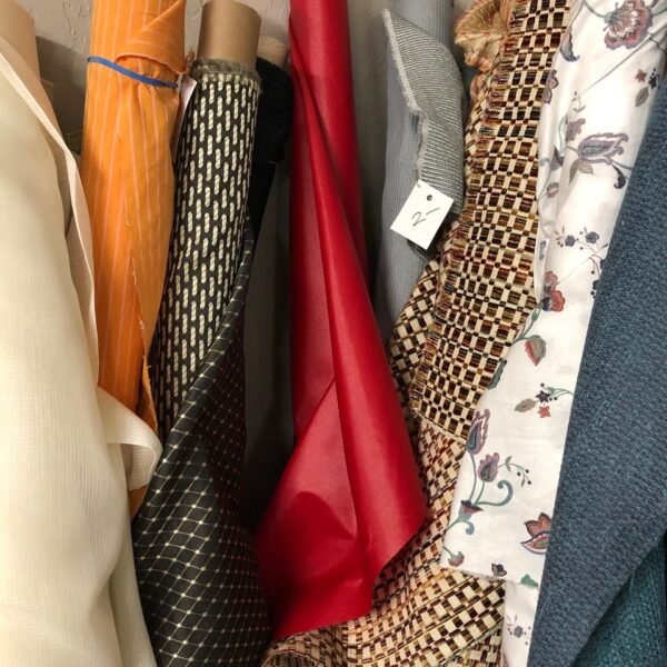 Todo tipo de telas, incluidas algunas muestras de diseñadores de alta gama que pueden ser muy costosas para comprar en el jardín, además de cuero, cerámica, baldosas de vidrio, molduras de madera, hilo, papel tapiz, recortes de alfombras, además de botones y cremalleras. , interfaces, etc