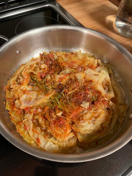 La foto de abajo muestra rodajas de repollo de 1/2 pulgada cortadas de un repollo pequeño y pobre. Al caldo le agregué unas cucharadas del puré de tomate sobrante, dos cucharadas de jugo de limón y un poco de agua. Las cantidades son medidas oculares, por lo que son aproximadas.