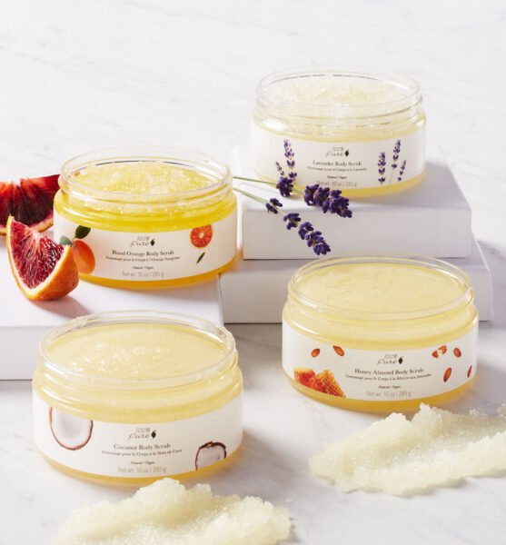 Nuestra nueva colección de exfoliantes corporales presenta cuatro deliciosos aromas derivados de aceites esenciales y sabores naturales aptos para alimentos.