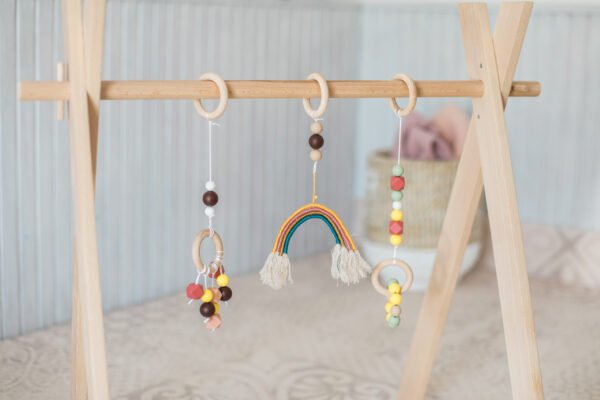 Uno de estos hermosos y simples pero elegantes gimnasios de abedul y álamo es adecuado para bebés recién nacidos y es una adición atractiva a los temas y combinaciones de colores de la guardería.