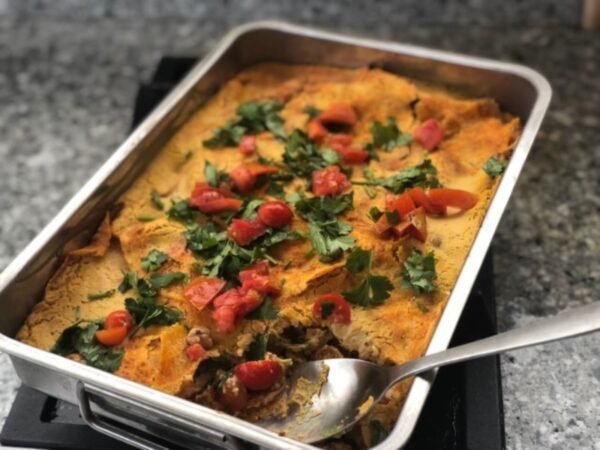 3. Montar la cazuela. Extienda una fina capa de salsa de manera uniforme sobre el fondo de una fuente para hornear de 10 por 8 pulgadas. Sumerge las tortillas en la salsa, cubriendo ambos lados, y apílalas en la esquina inferior izquierda del plato. Repita con más tortillas hasta cubrir el fondo de la cazuela. Agrega una capa de mezcla de verduras y unas 3 cucharadas de queso. Repita estas capas hasta llegar a la parte superior del plato y agregue la capa final de tortillas húmedas. Unte el resto de la salsa encima y agregue la salsa de queso encima de la cazuela.
