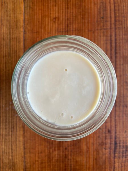 Hago suero de leche de soja con leche de soja casera, pero también puedes usar leche de soja comprada en la tienda para hacer este suero de leche vegano. No es necesario hacer leche de soja para hacer suero de leche. Sin embargo, si quieres preparar leche de soja, consulta las instrucciones aquí. Corté esa receta a la mitad. Una taza de soja produce más de 5 tazas de leche de soja, más una taza generosa de okara (pulpa de soja), que agrego a una tanda de granola (mientras tanto, guardé la okara en el congelador).